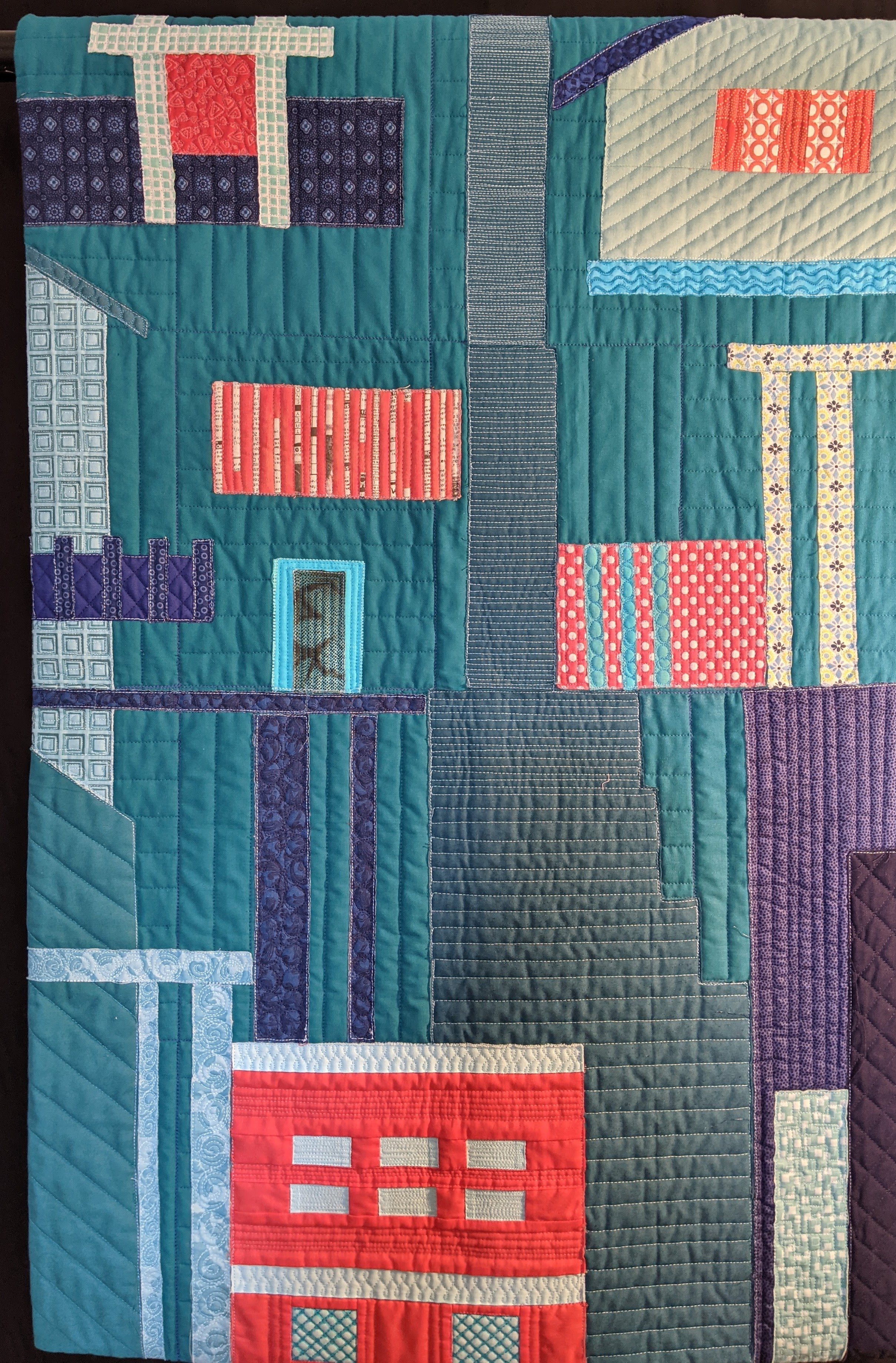 Finishing Up! Lecture/trunk show about design choices for edge finishes. Lecture contains over 40 quilts with ideas about added accents, facings, and edge treatments. The virtual lecture is a slide show that shows all the edge treatments and finishes up close.
